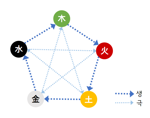 또한 외울 때 무엇이 무엇을 생 또는 극 하는지 유의하셔야 합니다. (목생화≠화생목 : 화생목은 존재하지 않음)