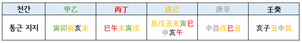 그러나 천간 木이면 木만 통근 지지, 천간 火면 火만 통근 지지인 것은 아닙니다. 다음 표를 참고해 주세요.