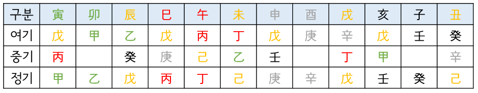 여기(餘氣), 중기(中氣), 정기(正氣)는 일단 초기, 중기, 말기의 개념으로 보시면 됩니다. 중기를 가지지 않는 지장간도 있습니다.