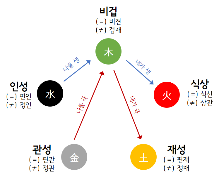 십신(十)일간을 주체로 한 음양오행의 관계를 의미합니다.
